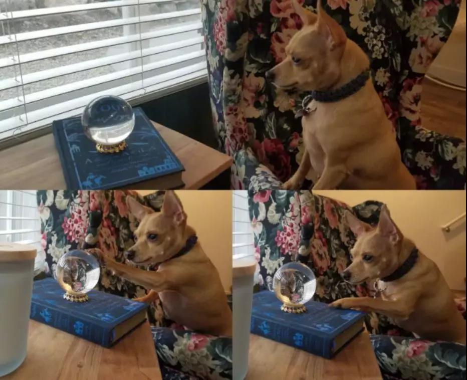主人剛開始不解,回來站到狗狗的角度,他才發(fā)現(xiàn)原來通過水晶球可以看見窗戶外的人行道,要是看到表現(xiàn)怪異的人,狗砸就會(huì)更不得鉆進(jìn)球里去視察......
